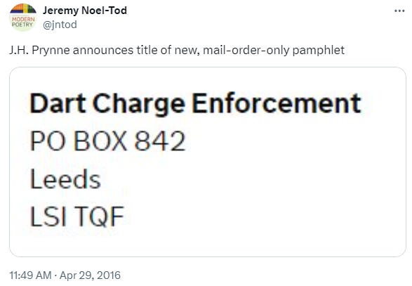 As the poet Michael Haslam once wisely observed, “after an initial bafflement” new sequences by Prynne “should be put on a shelf to mature for a couple of years, after which they become, mysteriously, more accessible.” But even other people who like Prynne — who write like Prynne — have admitted to me that they haven’t kept up with the recent overdrive in production. One deterrent is cost: many of these pamphlets are beautifully printed, but with postage cost more than a tenner a time. So on that measure at least, £25 (paperback) / £35 (hardback) for the 36 sequences in Poems 2016—2024 is a welcome end to Prynnflation.