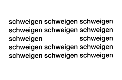 Gomringer’s fourteen printed words do not collectively or individually convey their meaning as effectively as the one unprinted one implied by the blank in the middle. Should we read them aloud? If so, would it be soothingly (to a child?) or shouted (as a command?) And does the language we are reading make a difference? Gomringer originally composed the piece using the German word “schweigen”: