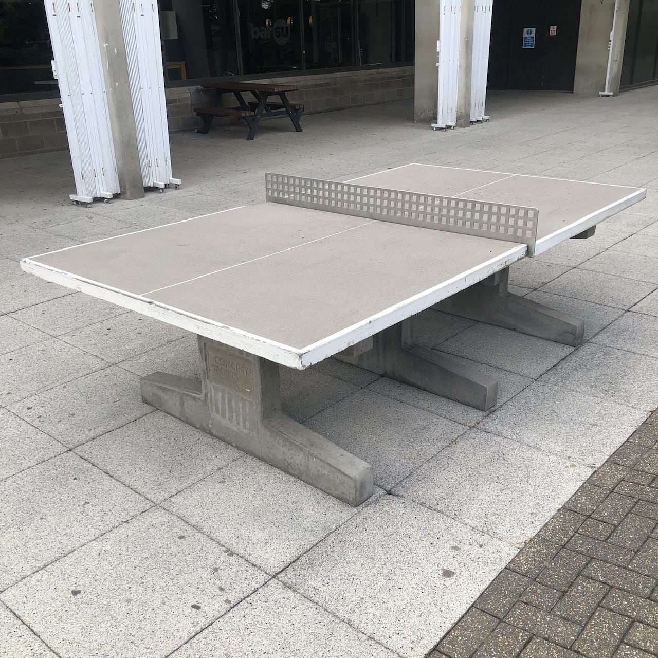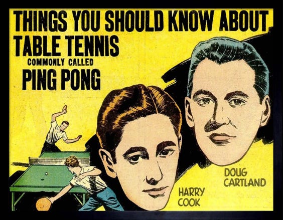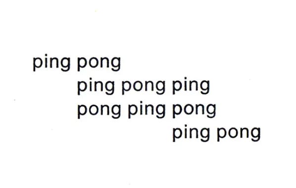(With its rubber bats and plastic ball, ping pong — the name was trademarked in 1901 — was a modernist sport which would achieve global reach. The International Table Tennis Association was formed in 1926, one year after Eugen Gomringer was born, and twenty years after Gomringer’s poem first appeared, the binary back-and-forth of table tennis, with its simple set-up and rules, would form the basis of a new “kind of play-activity” for humanity: the first commercially successful video game, Pong.)