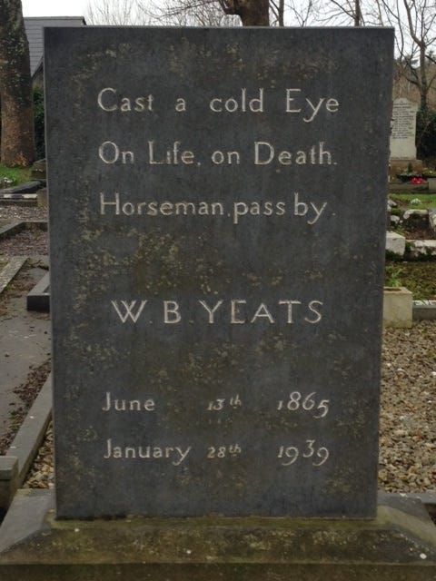 As the editors remark, this was written in August 1964 after visiting the churchyard in Drumcliffe, Sligo, and “expresses an early uncertainty about the whole poetic enterprise relatively rare in [Heaney’s] writing”. It alludes to Yeats’ late poem “Under Ben Bulben”, the last three lines of which are carved on the Drumcliffe gravestone (“Cast a cold eye / On life, on death / Horseman, pass by!”), and which also commands: “Irish poets learn your trade”. If Heaney felt doubt in August 1964, though, he soon found a counterweight of determination, because in the same month he wrote “Digging”, the poem that would open his debut volume, Death of a Naturalist (1966), by asserting his “trade”. And this too seems to have lines from “Under Ben Bulben” behind it. Compare Yeats’ vision of death giving rise to life —